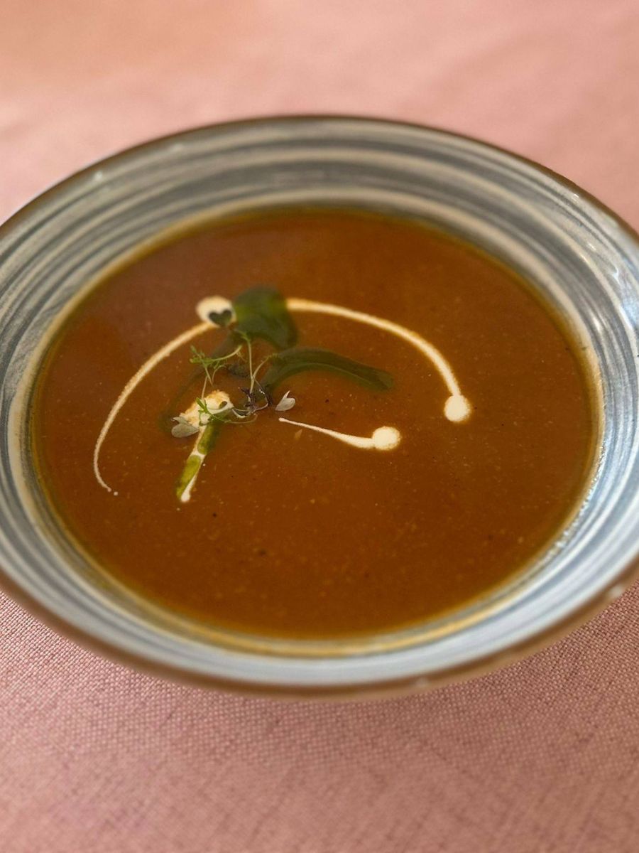 - Polévka: Krém z pečených rajčat s bazalkovým pestem